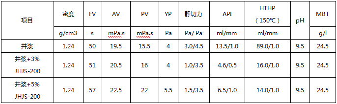 现场应用表明,JHJS-200能明显改善原钻井液中压、高温高压滤失性能,能满足高温高压深井钻井要求,且该产品无荧光,对电测无影响。