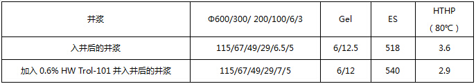 重庆地区页岩气开发使用油基钻井液,原使用降滤失剂效果不明显。2015年3月,甲方在JY46-3HF井替换了原降滤失剂,在井浆中加入HW Trol-101后,失水降低,破乳电压增加,粘度无变化(测试数据详见表1)。与原降滤失剂相比,HW Trol降滤失效果明显,价格更低,已在该地区推广应用。
